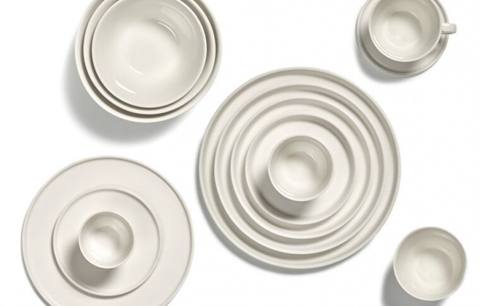 Puristisches Design von seiner edelsten Seite, das bietet die Serie CENA des Designers Vincent van Duysen. Schlicht und warm, in cremeweiß gehalten, aus feiner Porzellan, so bietet das Geschirr eine perfekte Bühne für raffinierte Gerichte und Dekorationen. Erhältlich sind Teller, Tassen und Schalen in verschiedenen Größen und Formen und dazu passende Gläser. Die CENA kann wunderbar gestapelt und die kontrastreichen elfenbein- und sandfarbigen Teile beliebig kombiniert werden. Das Geschirr wirkt warm, aber zugleich auch sehr modern und puristisch.